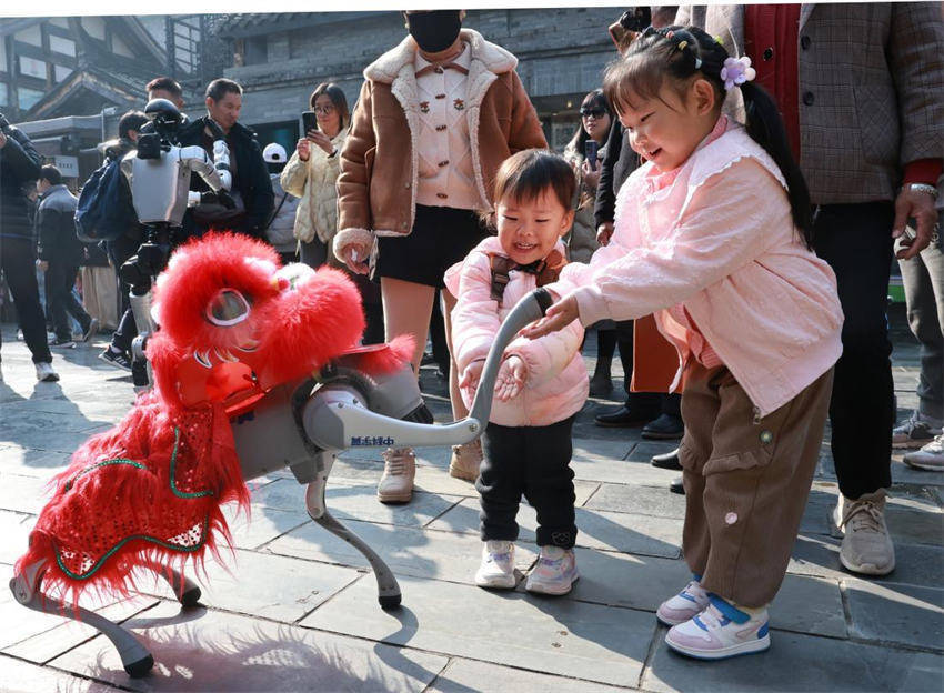 在宽窄巷子,四川中科宇翼科技有限公司的人形机器人“小宇”正在与游客互动,为现场带来充满科技感的解说体验。